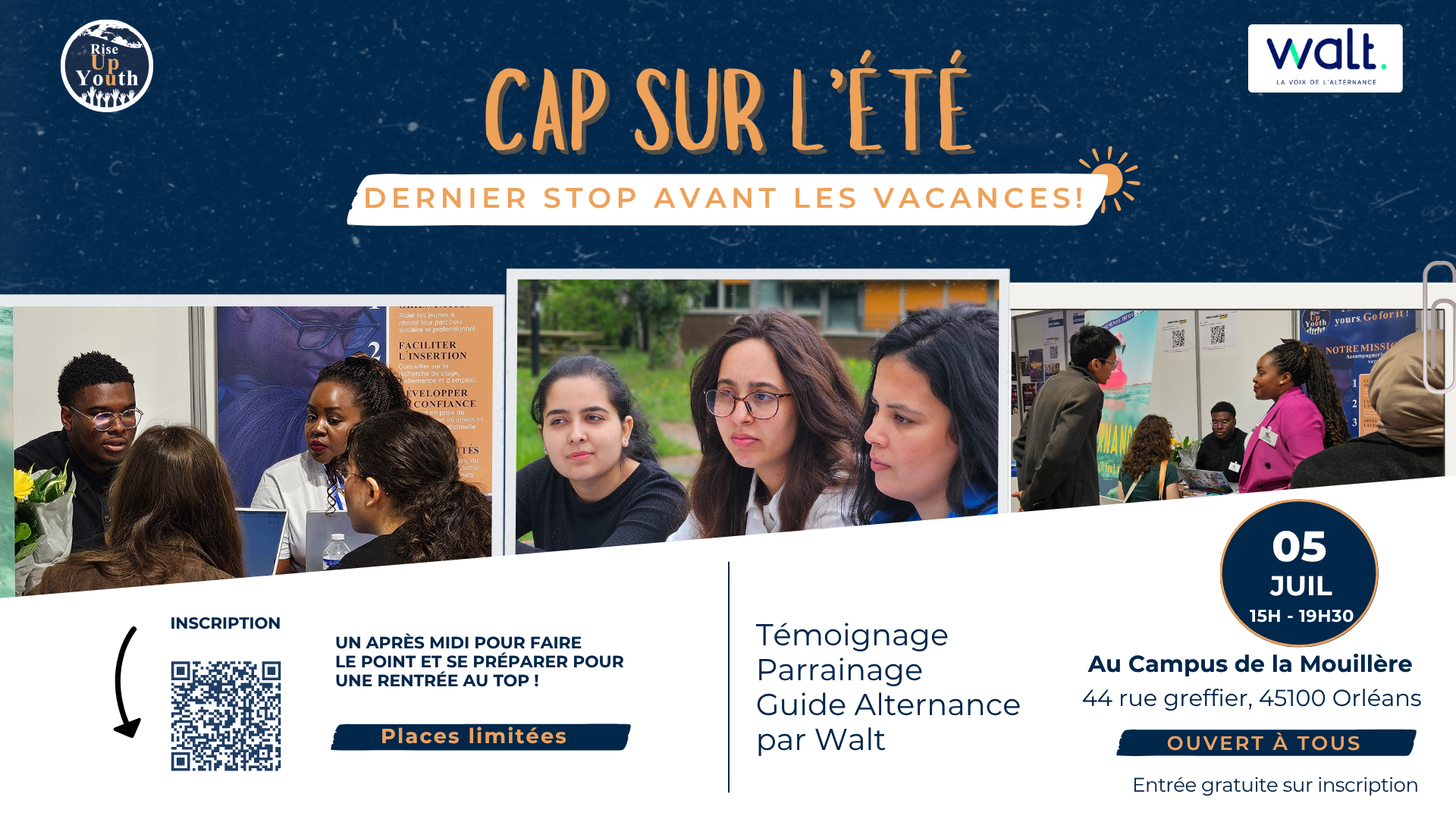 📅 Samedi 5 juillet 2025 🕒 15h00 – 19h30 📍 Campus de La Mouillère – Orléans Adresse: 44 rue greffier 45100 Orléans Avant de partir en vacances, faites une pause. Prenez un moment pour faire le point, échanger, vous inspirer, et vous organiser pour la suite. “Cap sur l'été est un événement Rise Up Youth à la fois un instant convivial et professionnel, conçu pour les jeunes de tous horizons. Que vous connaissiez déjà notre association ou que vous veniez pour la première fois, vous êtes les bienvenu·es. Au programme : ✅ Témoignages inspirants de jeunes engagé·es et de professionnel·les ✅ Ateliers pour faire le bilan et préparer la rentrée ✅ Parrainage express entre étudiant·es ✅ Inscriptions à notre programme d’accompagnement ✅ Distribution gratuite du Guide Alternance by Walt ✅ Micro ouvert, animations et temps libre 🎁 Une ambiance bienveillante, des échanges authentiques et une équipe à l’écoute. Entrée gratuite sur inscription- les places sont limitées. Venez comme vous êtes, repartez avec des repères. Parce que vous avez le droit de rêver. Et nous sommes là pour que ces rêves tiennent debout!